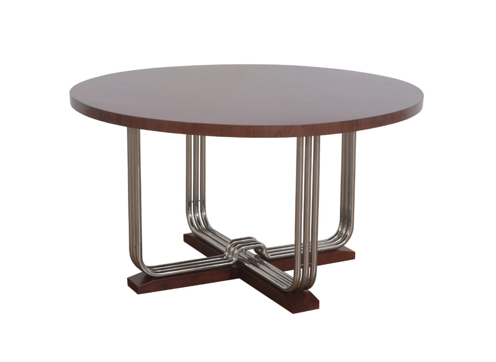 Deze ronde eettafel in Art Deco stijl met rvs buizenframe is een ware design beauty.