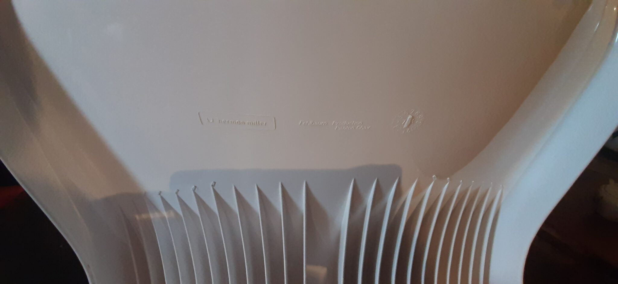 De Vintage Herman Miller stoel Verner Panton staat bekend om zijn vloeiende, organische vorm die naadloos uit één stuk kunststof is gegoten. Dit maakt de stoel niet alleen een waar kunstobject, maar ook verrassend comfortabel. Hoewel deze specifieke stoel niet gemerkt is met de originele sticker, bevestigt de FEHLBAUM-productiestempel de authenticiteit en het productiejaar.
